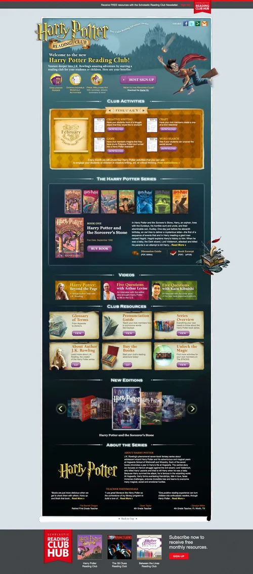 A variety of landing pages for Scholastic and their partners. Features range from custom forms, animation, custom slideshows, etc. Major partners include Harry Potter, Frosted Mini Wheats, Dove, and Parent & Child Magazine.